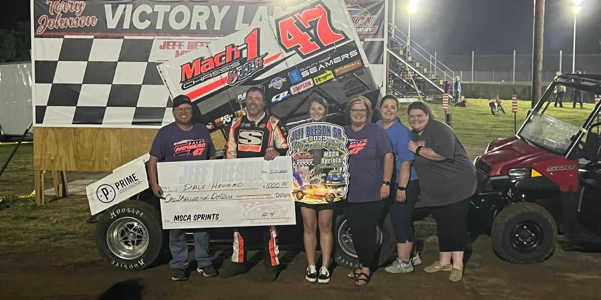 Dale Howard wheeled his #47 Dale Howard Racing / Quality Roof Seamers / Mach 1 chassis Sprint Car to victory lane Saturday night by leading every lap in the MSCA feature at Benton (MO) Speedway. Saturday's win is the first victory of the 2023 season for the Tennessee-based multi-time Sprint Car champion.